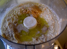 Add half of tahini, peanuts butter, lemon juice, sugar, olive oil, garlic and a ladle or two of the hot water, and process until all are roughly blended.