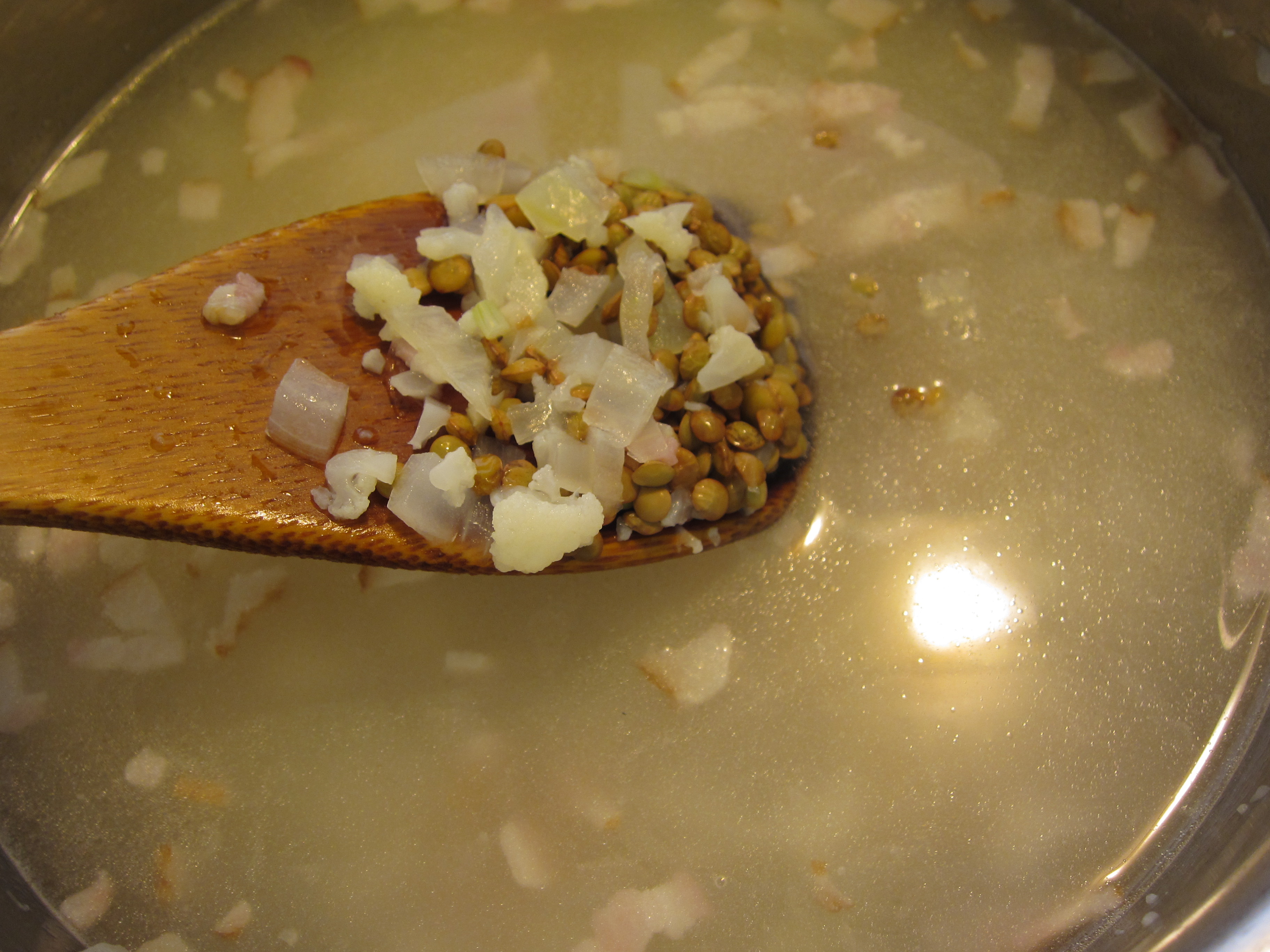 5) When lentil is soft, add the sausage and simmer for 2 min.