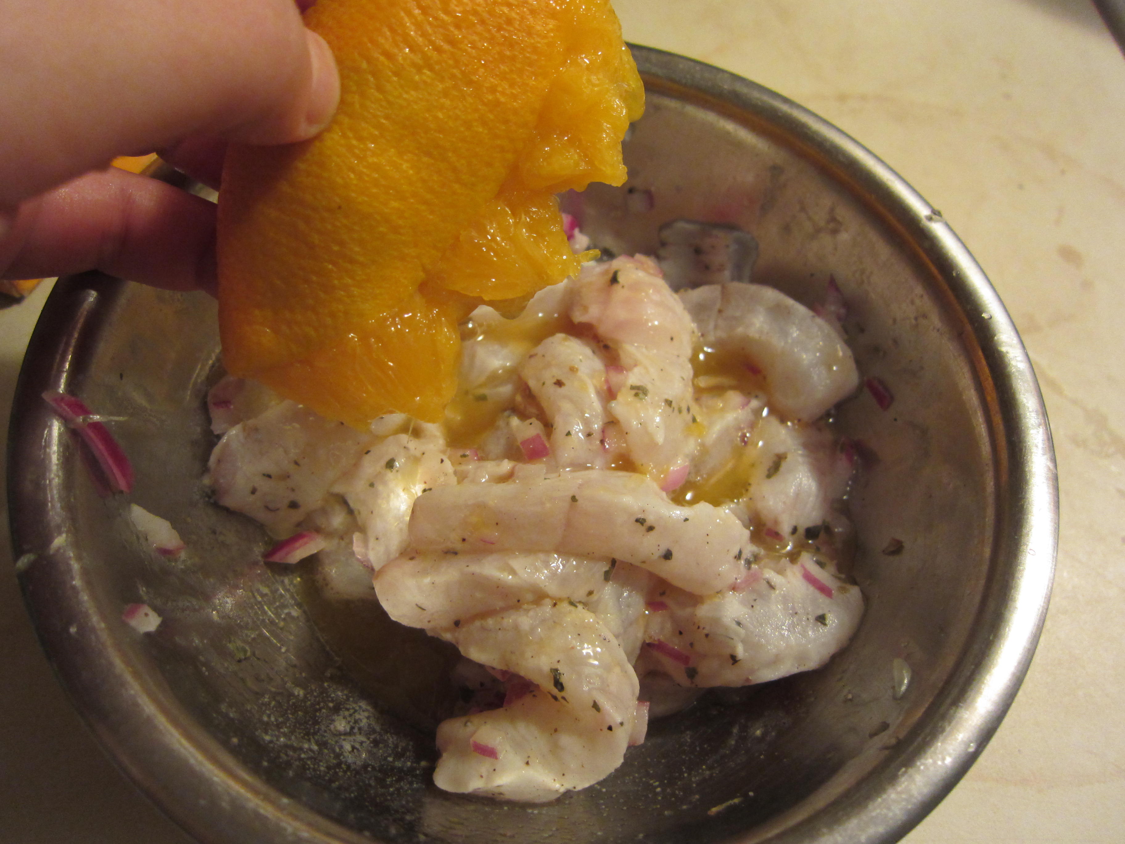 2) Place the cut fish in a bowl and add lemon juice, 3tbs of lime juice, chopped onion and dried oregano. Toss well and let it marinate in the refrigerator for 1-2 hours.
