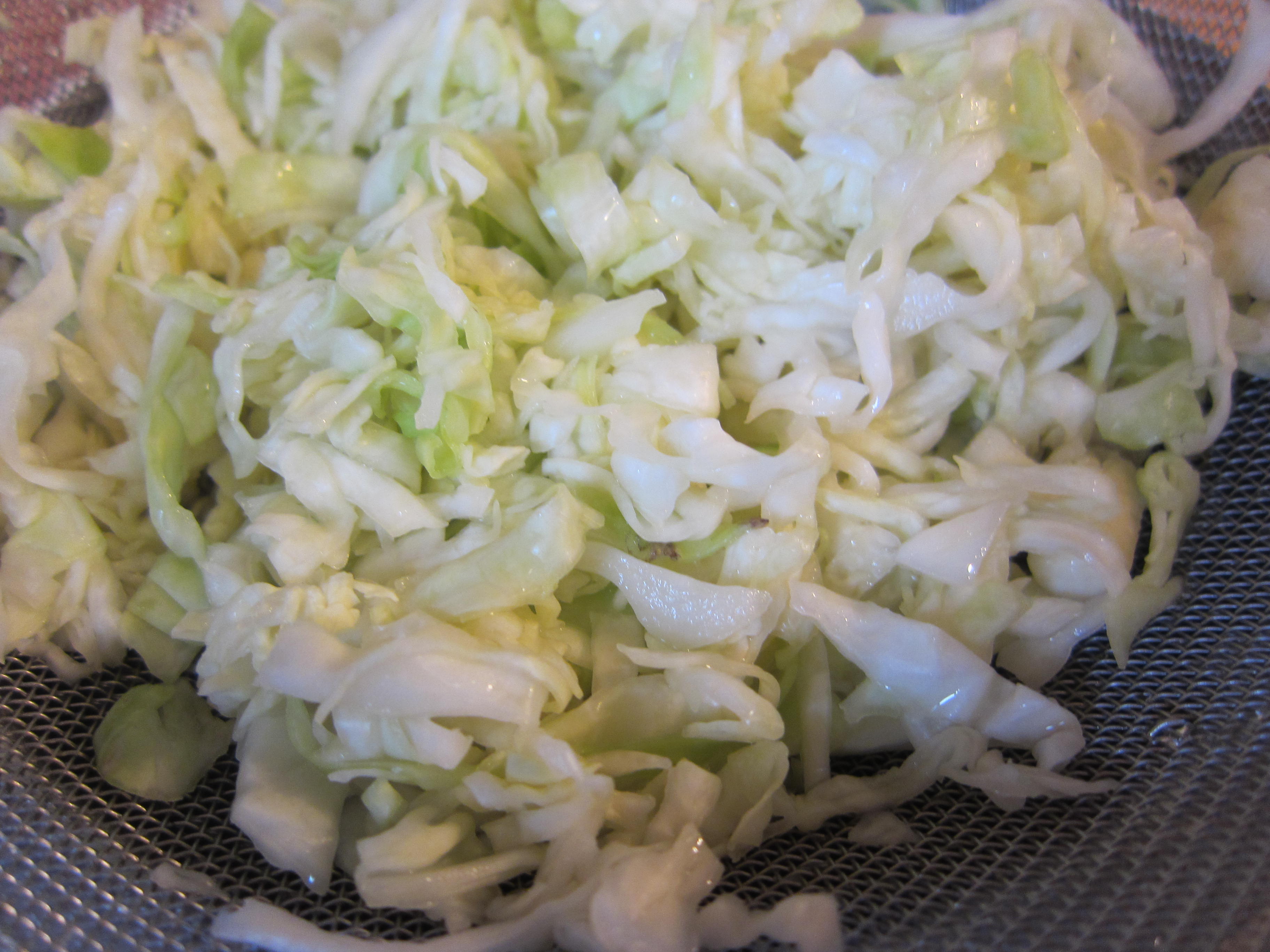 Add 1 tbs of salt and mix thoroughly and let stand for 10-15 minutes until the cabbage becomes softer.