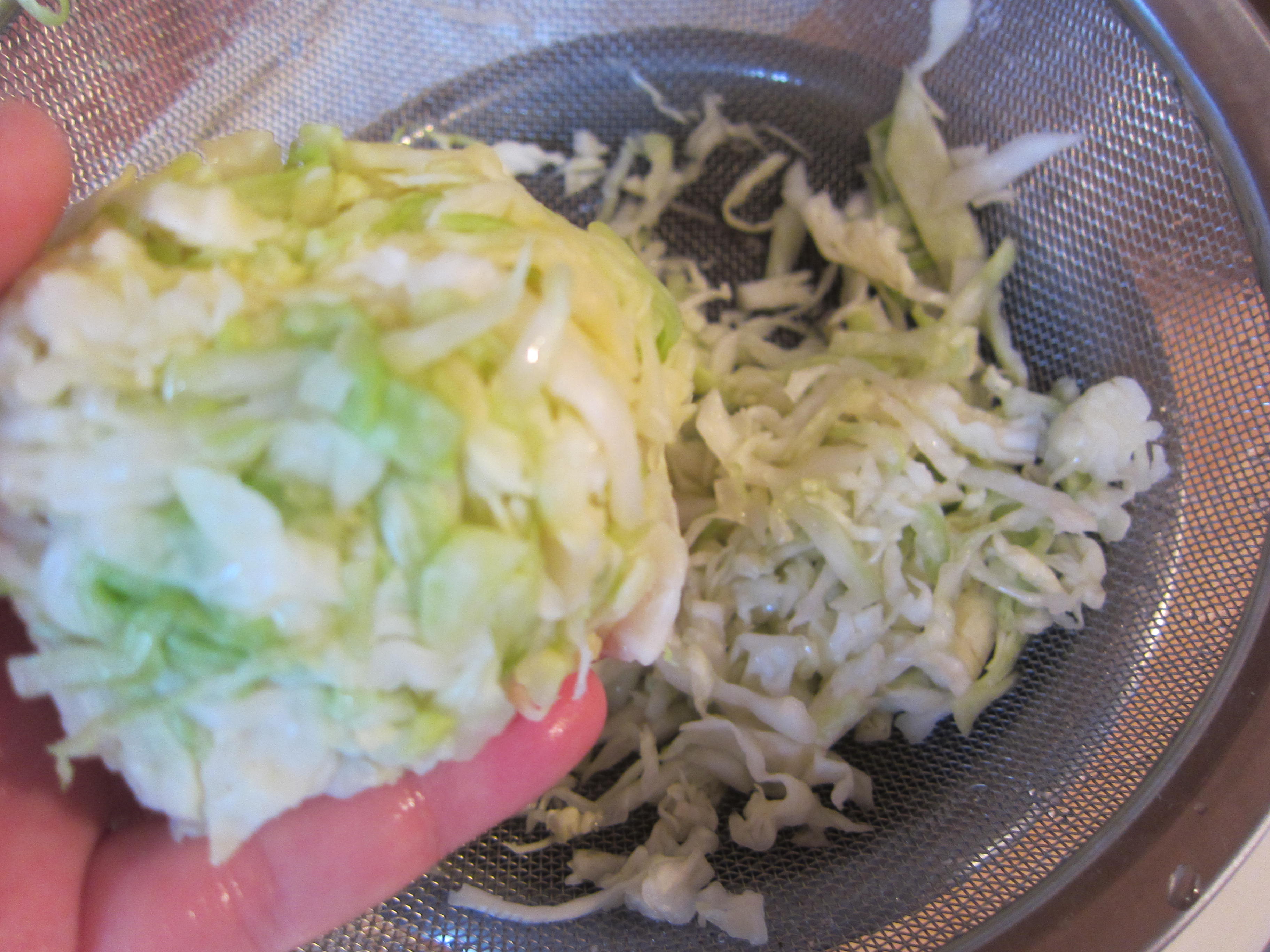 3) Wash the salted cabbage with water, rinse and squeeze hard to remove as much water as possible. The cabbage should no longer be salty.
