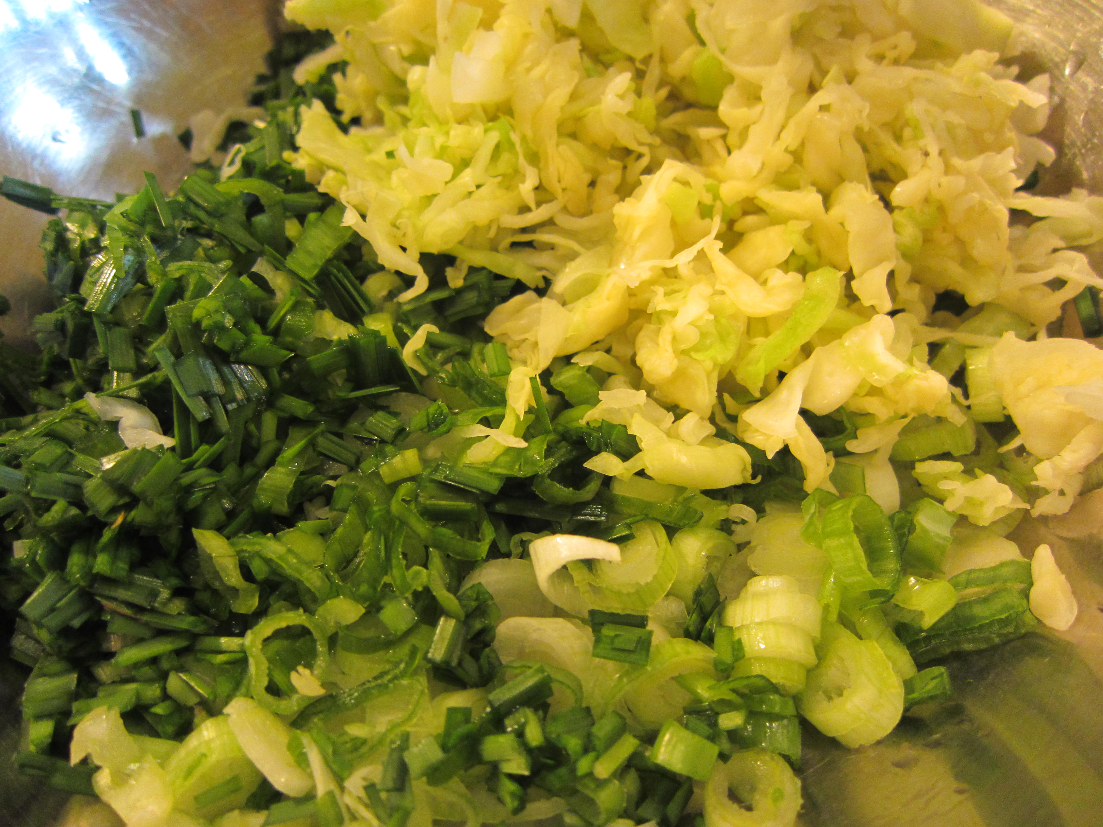 4) Put the chopped scallion, the chive, and the squeezed cabbage in a big bowl.