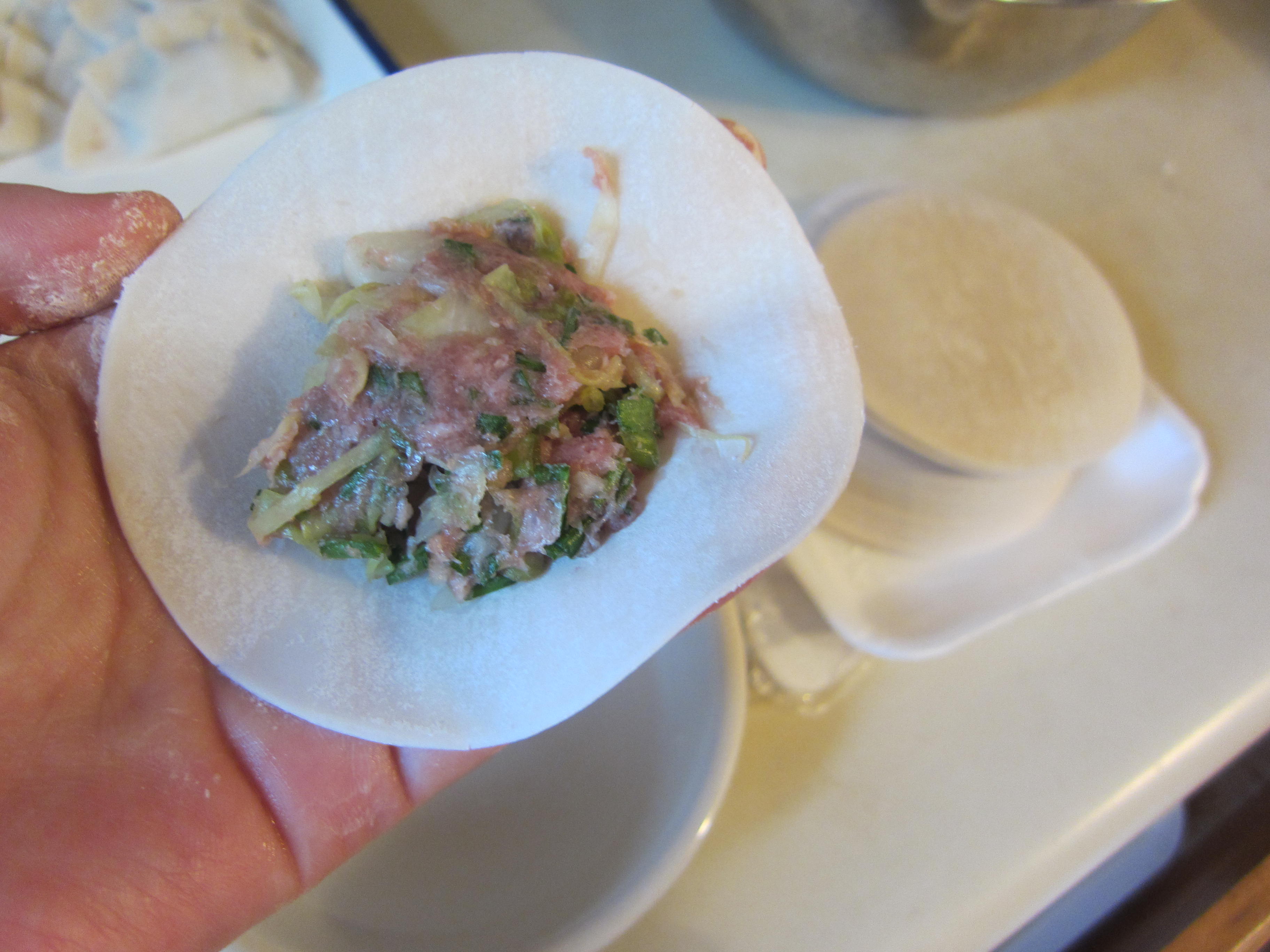 5) Before you start wrapping, you need a spoon and a small bowl filled with water. Have a sheet of gyoza wrapper on the palm of you left hand, and place a spoonful of filling in it.
