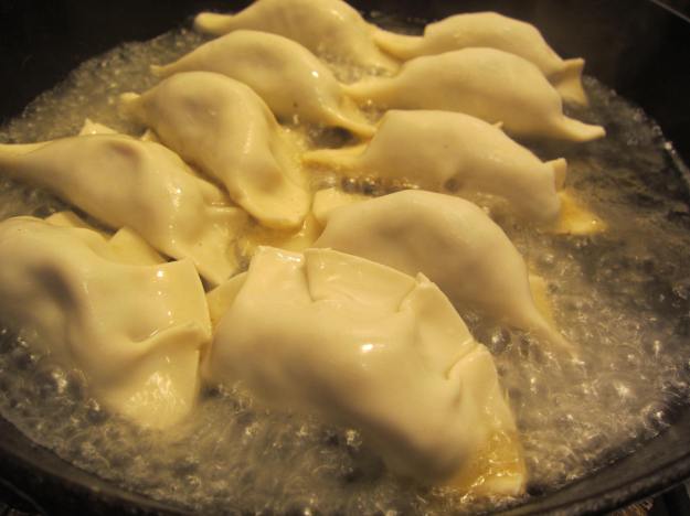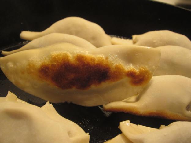 6) I think a non-stick frying pan is best to use. Remember the pan needs a fitting lid. Heat the pan over medium-high heat and add a spoon of oil (even though you use a non-stick pan). Put the gyoza in the pan and heat until the bottom is nicely brown, about 2 minutes.