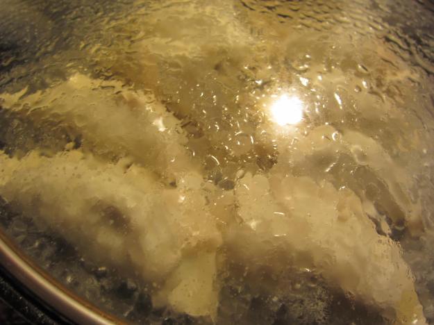 8) When the water is almost gone (about 3-4 minutes), open the lid and drizzle gyoza with some oil to make it nicely crisp.