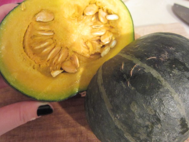 1) Cut the Kabocha in half with a large, heavy knife. Remove the seeds and cut into a bite-size cubes. Boil or steam until soft, about 7-10 minutes.