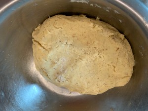 3)Add 1)flour mixture at once, knead the dough with your hand until it comes together. It should not take more than 3 minutes, you do not need to knead it persistently like you do for bread dough.