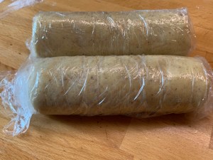 4)Roll the dough into a log or two, then wrap it in plastic wrap. Chill the dough for one hour in the fridge, or you can do this a few days ahead.